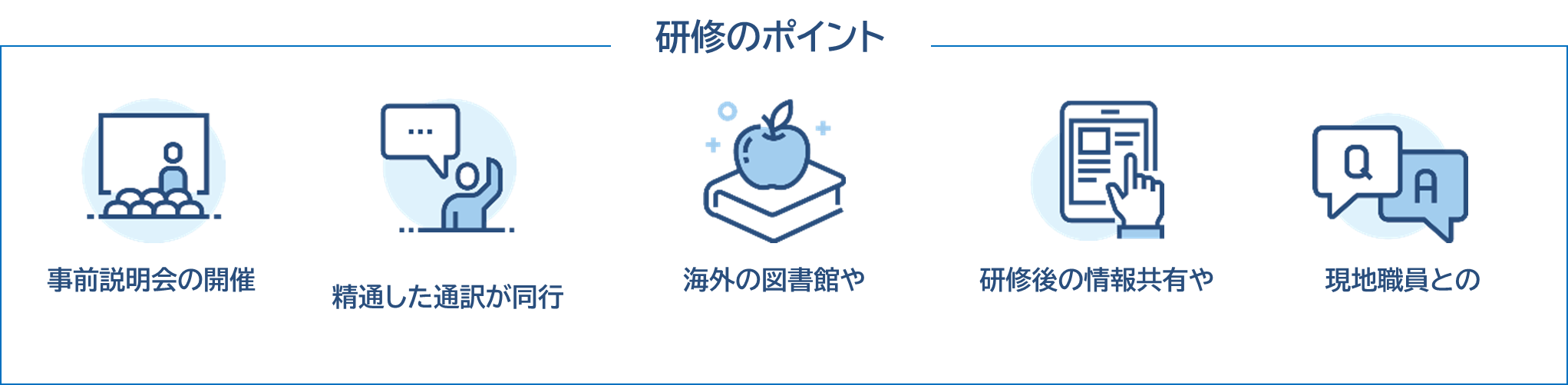 事前説明会の実施や訪問先の図書館に関する情報のご提供、研修後のフォローアップなどを行い、本研修での学びがより深まるようサポートさせていただきます。