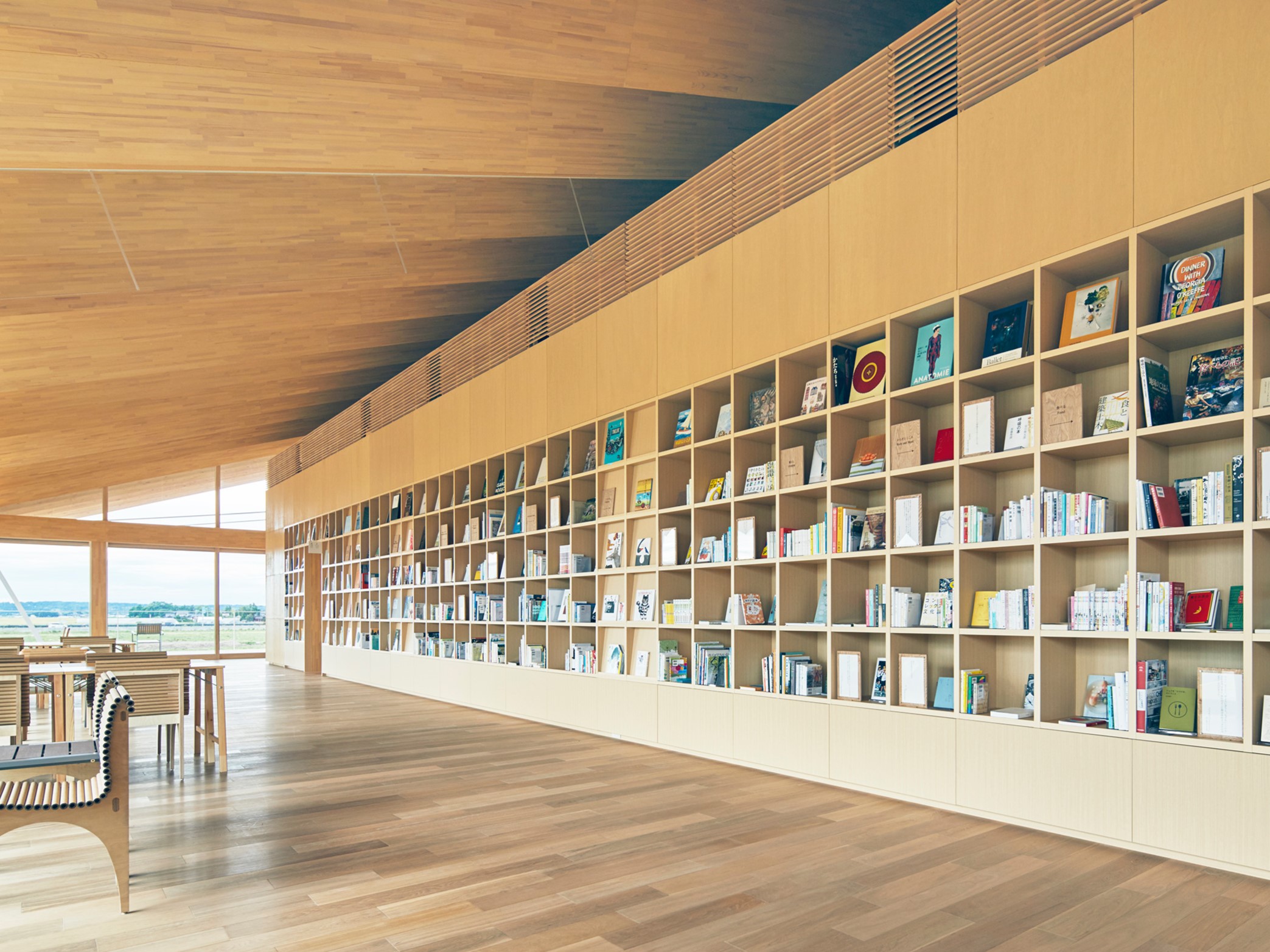 2024年5月に開館したばかりの図書館。「絵のある図書館 本のある美術館」というコンセプトを持つ、本とアートが融合する庄内地域の文化拠点です。放射状の天井には山形県産の木がふんだんに使用され、まるで「本の森」にいるかのような温もりが魅力の建築です。館内には、庄内町名誉町民・内藤秀因氏の美術館があり、水彩画約2千点が収蔵・展示されています。