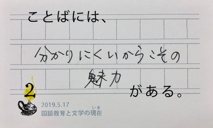 現在の国語教育においていかに実用性や明確性が重視されているかについては、その実態を知らずにいただけに若干の驚きと共に拝聴しました。個人的には後半の「銀の匙」読解が秀逸で、私は講演後すぐに購入し読みました。ともすれば忘れがちな文学教育の重要性を改めて実感した次第です。非常に説得力のある講演でした。(50代)