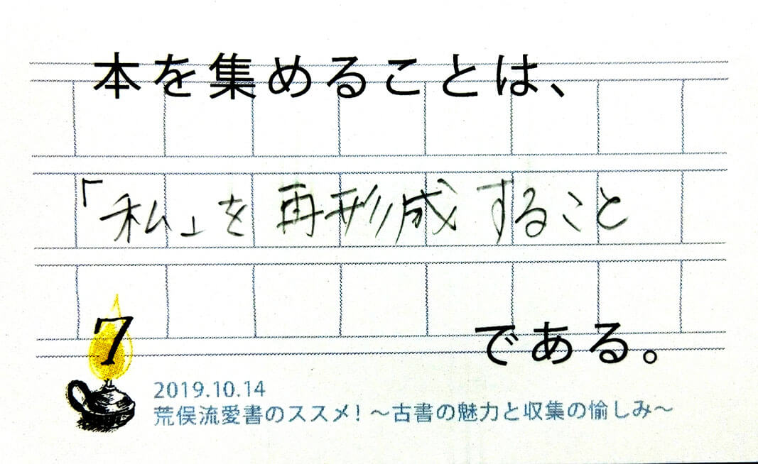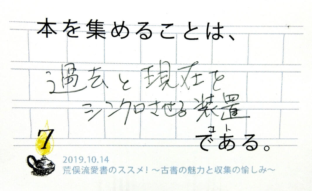 「書物」こそが持つリアリティ――対峙した人を驚嘆させる実体の重みや迫力をいかに伝え、さらには本をその手に入れるということへの悦びをいかに後の時代へ繋いでゆくか。私たちも身の引き締まる思いで熱いメッセージを受け取りました。「ビブリオマニア」荒俣先生ならではのエピソードには、参加者の皆さまから感嘆の声、時に笑いも起こりながらの、あっという間の90分。荒俣先生の書物に向ける深い愛情を垣間見た時間となりました。