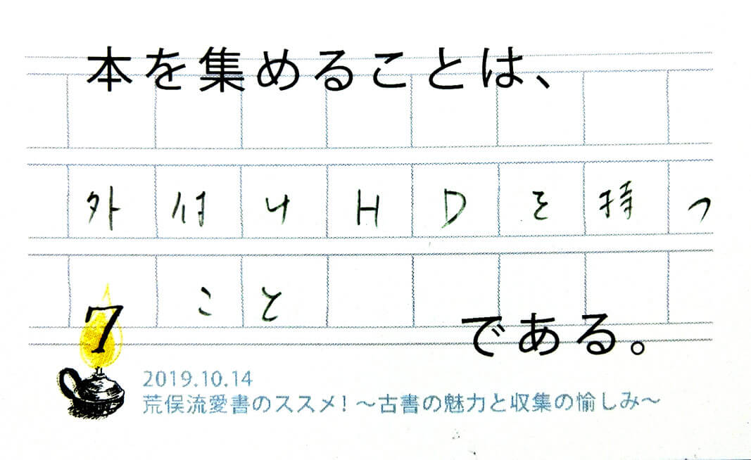 荒俣先生の講演会に参加したのは2回目でしたが、古今東西の著名な書物について荒俣先生独自の視点で解説をして下さり、書物を収集し、書物を味わうことの重要性や醍醐味などが感じられる講演会でした。また、荒俣先生は妖怪の専門家でもあるので、次回の講演会ではそうした分野に関するお話も聴きたいです。