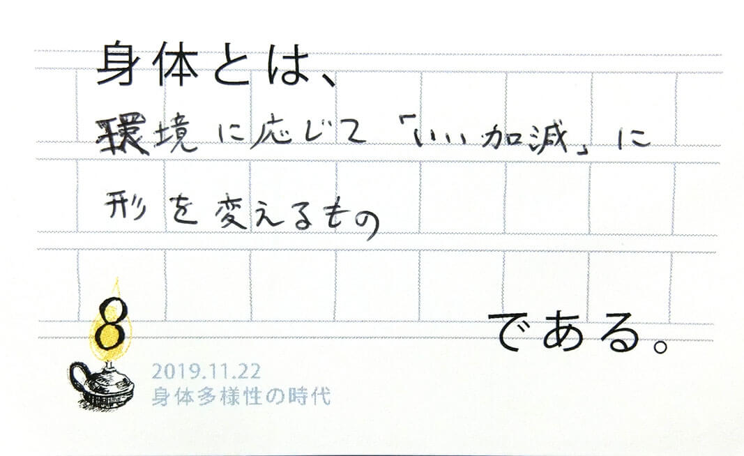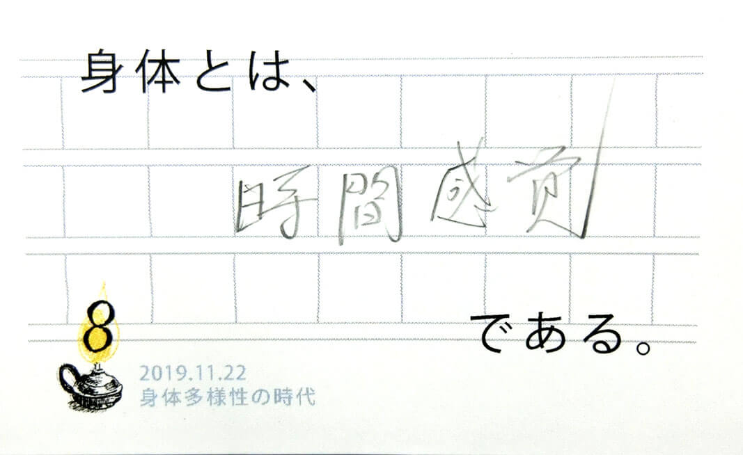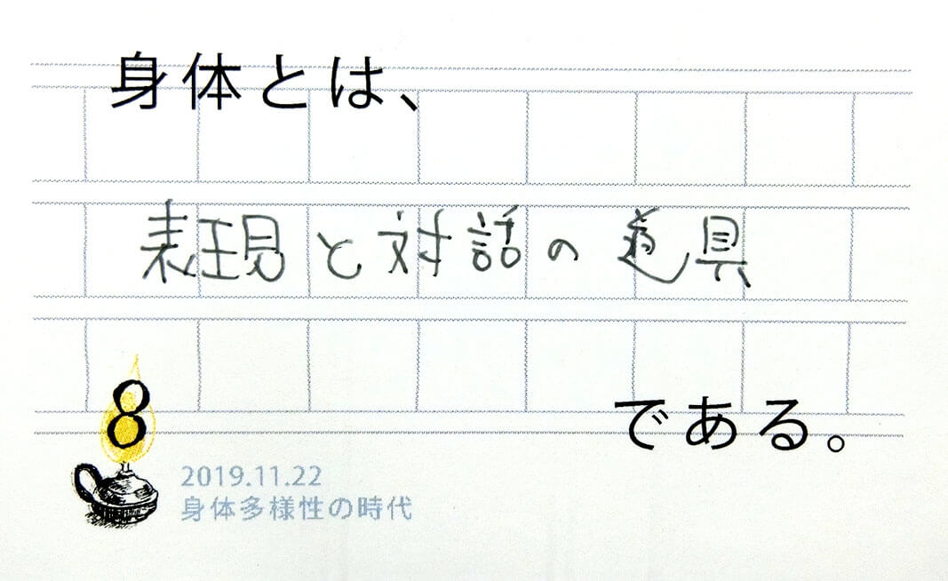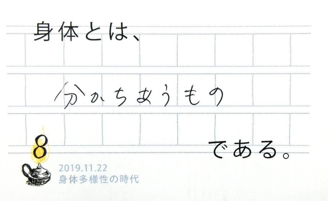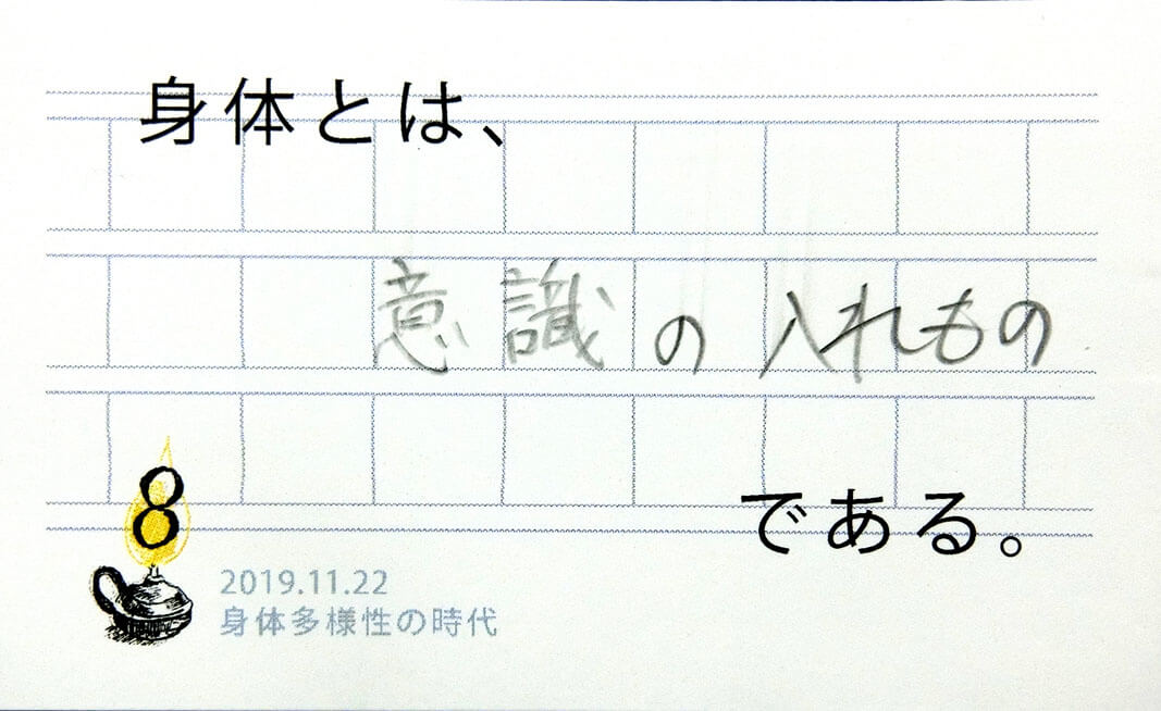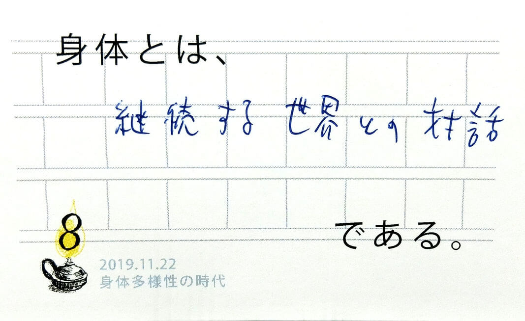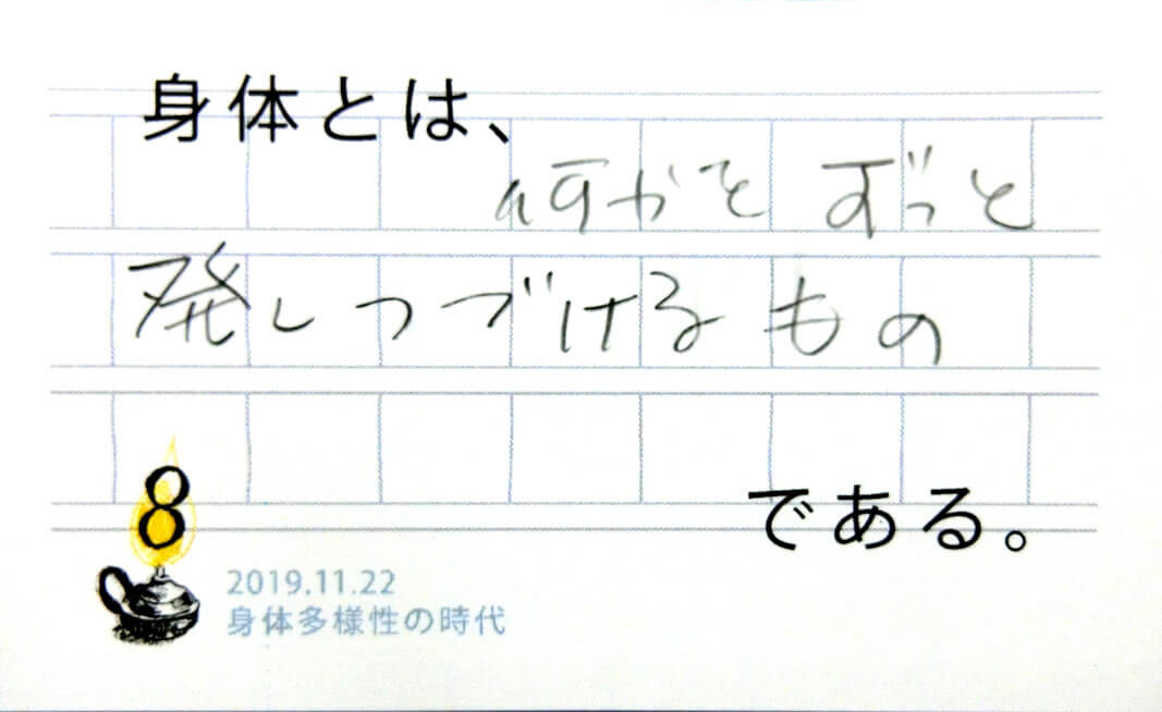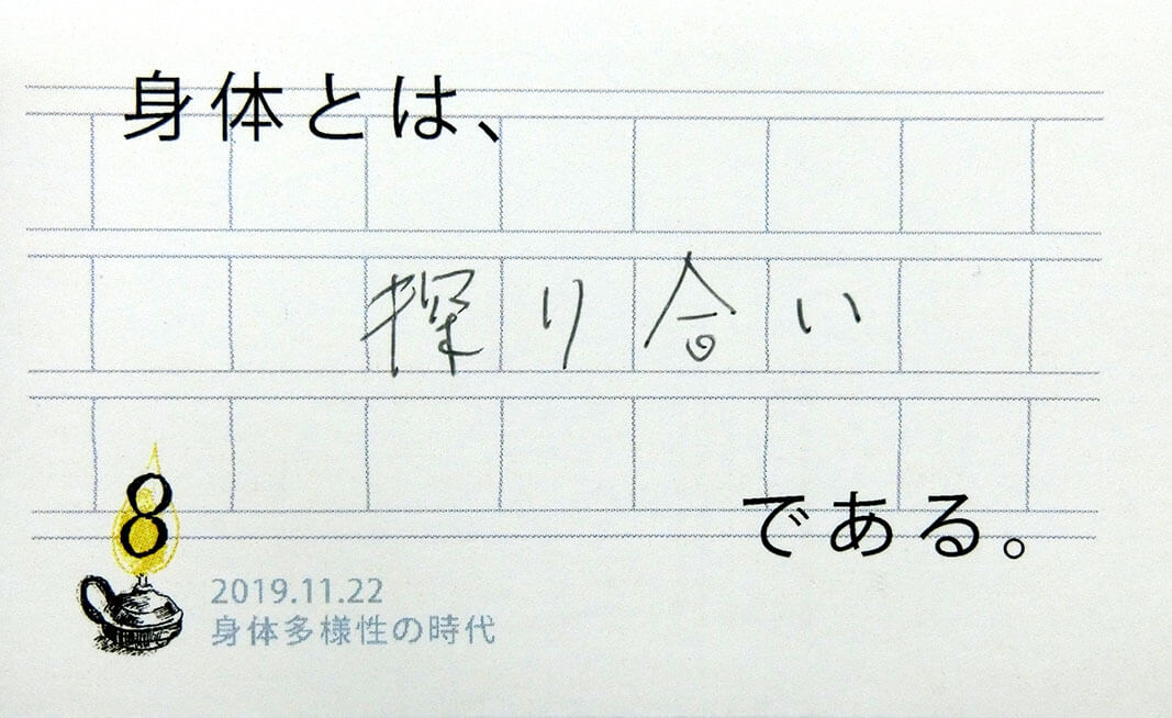 一人の人の中にも多様性があり、自分の体(と認識する事)の輪郭が揺らいだり安定しているときがあります。「自分の体が自分のものでないように感じたことは?」「他人のことなのに自分の体であるかのように感じたことは?」会場ではこのような共有があり、多様さを受け入れる他者や自分との関わり方のヒントをいただきました。(40代)