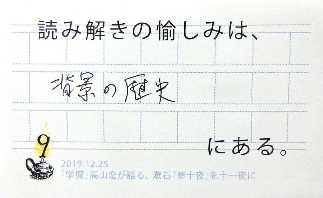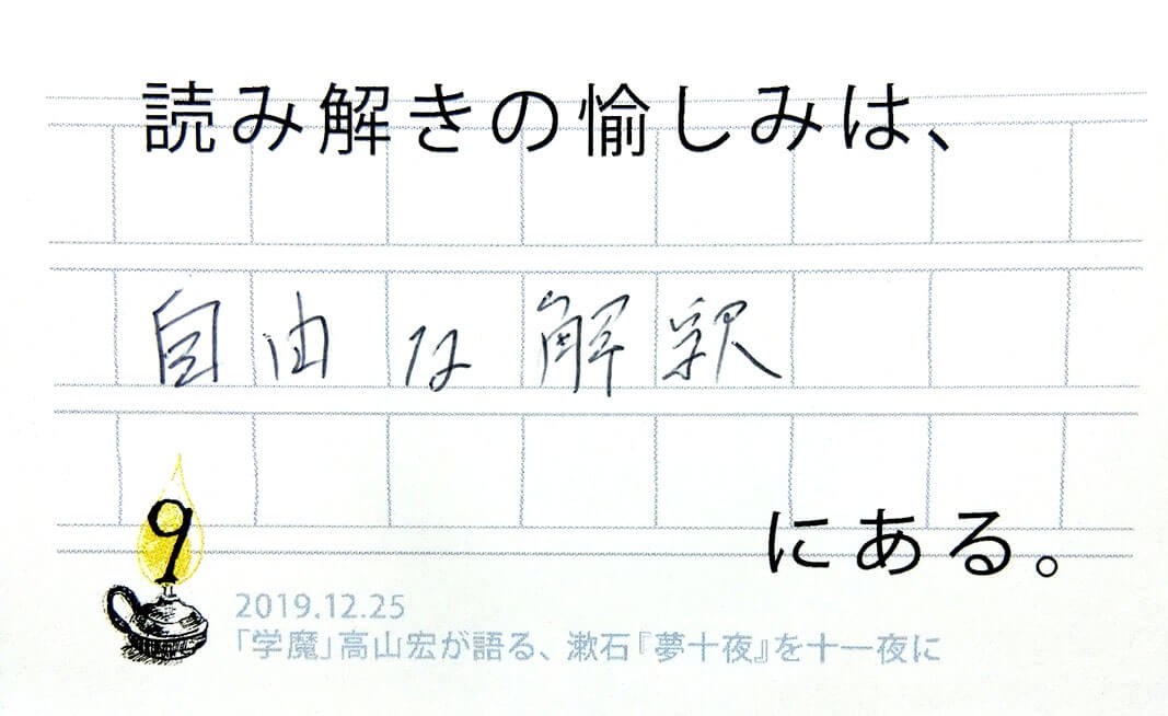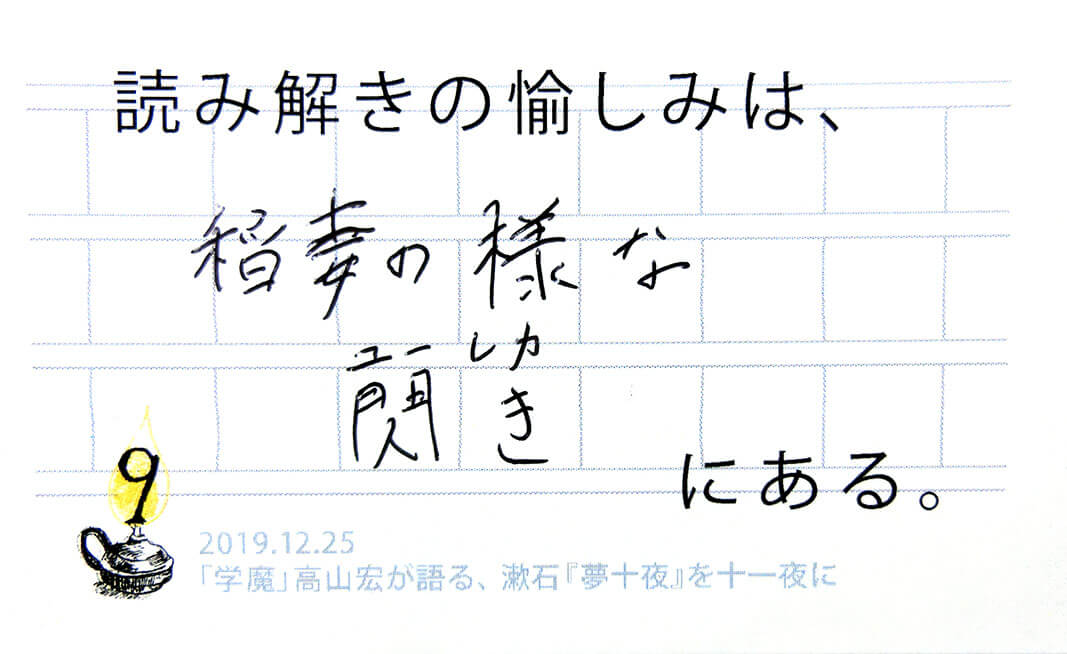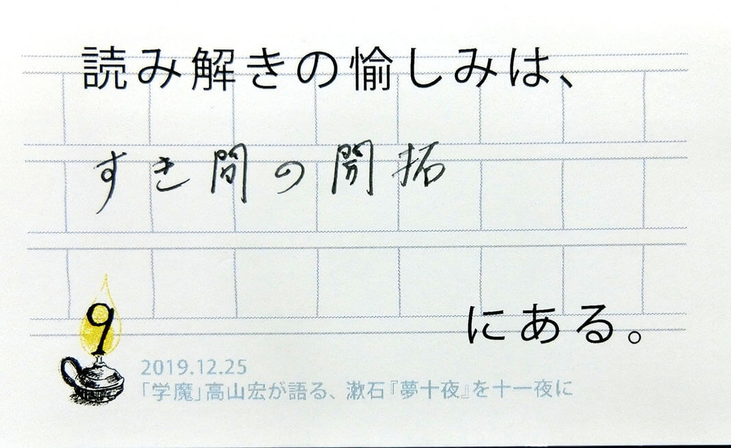 クリスマスの夜に「たかや魔ひろし」先生の淀みない美声が響きました。イギリス文学者からみた夏目漱石、デフォーのメルカトールサピエンス(知の商人)から、OED、ちゃぶ台とテーブル、シェイクスピアと、たかや魔の知が縦横無尽の講義でした。夢十夜に届く前に素敵な時間がタイムアウト。この講義が「夢十一夜」となりました!(40代)