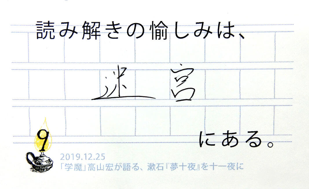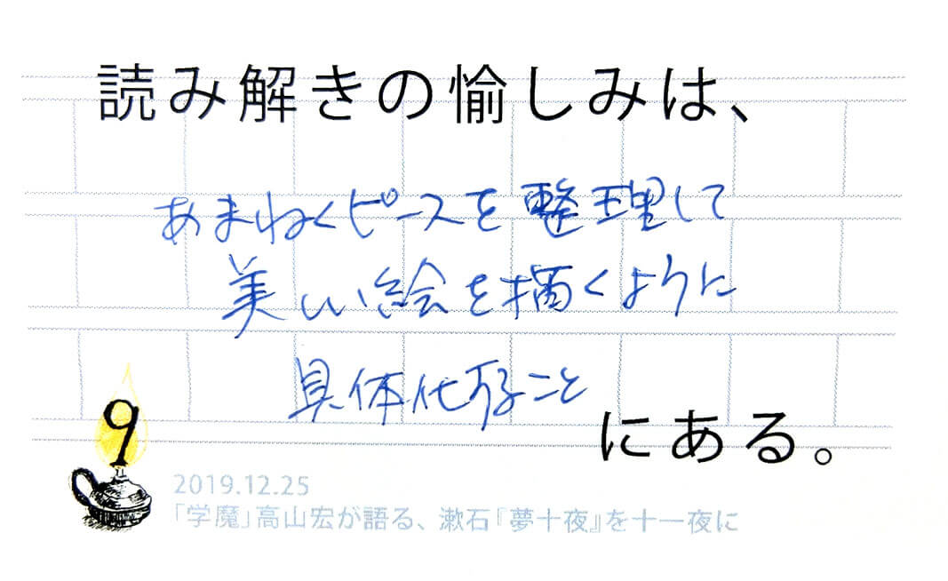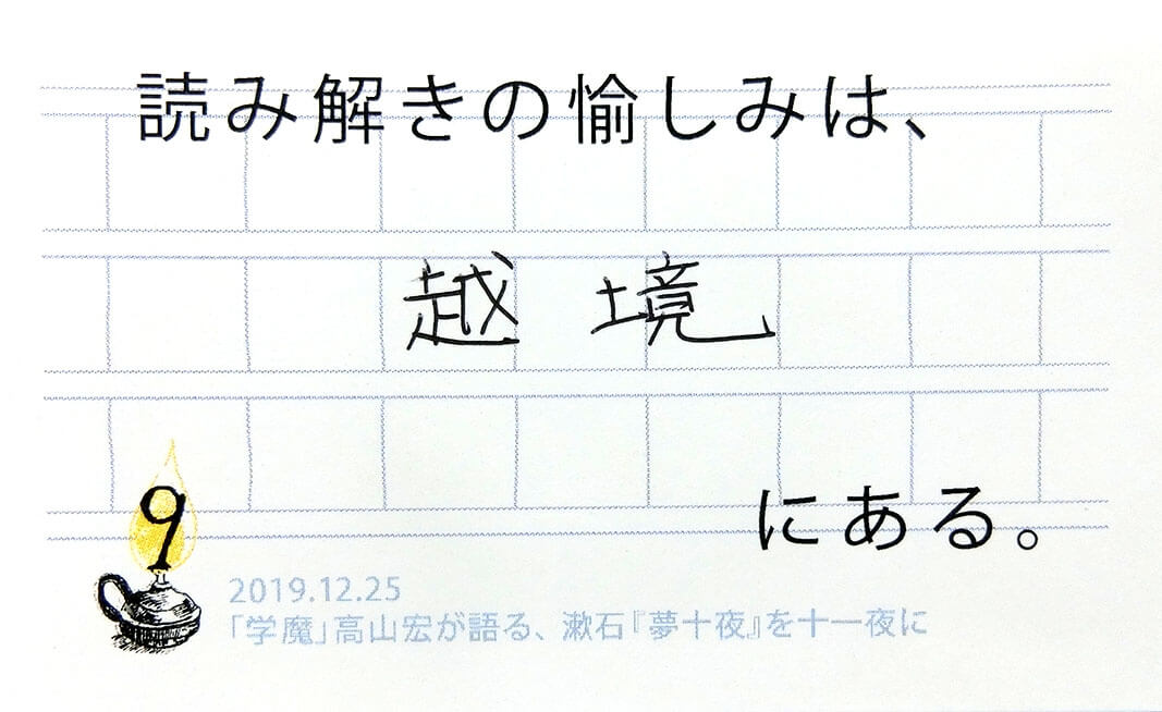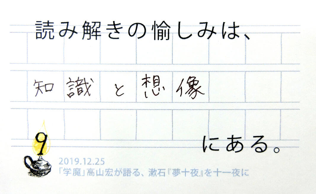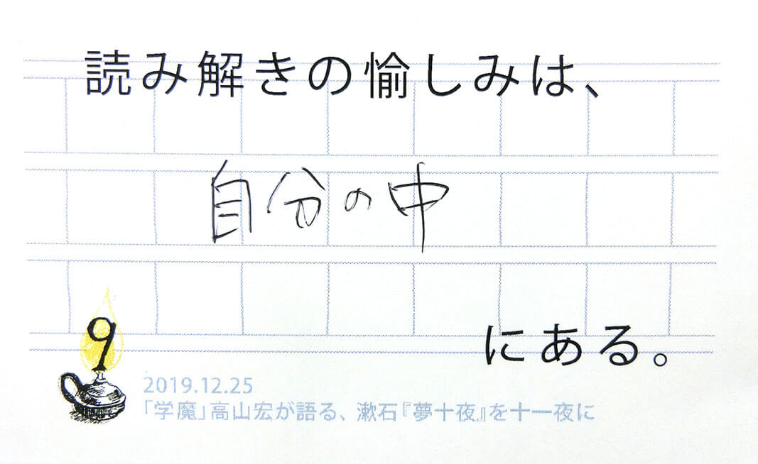 クリスマスの夜に「たかや魔ひろし」先生の淀みない美声が響きました。イギリス文学者からみた夏目漱石、デフォーのメルカトールサピエンス(知の商人)から、OED、ちゃぶ台とテーブル、シェイクスピアと、たかや魔の知が縦横無尽の講義でした。夢十夜に届く前に素敵な時間がタイムアウト。この講義が「夢十一夜」となりました!(40代)