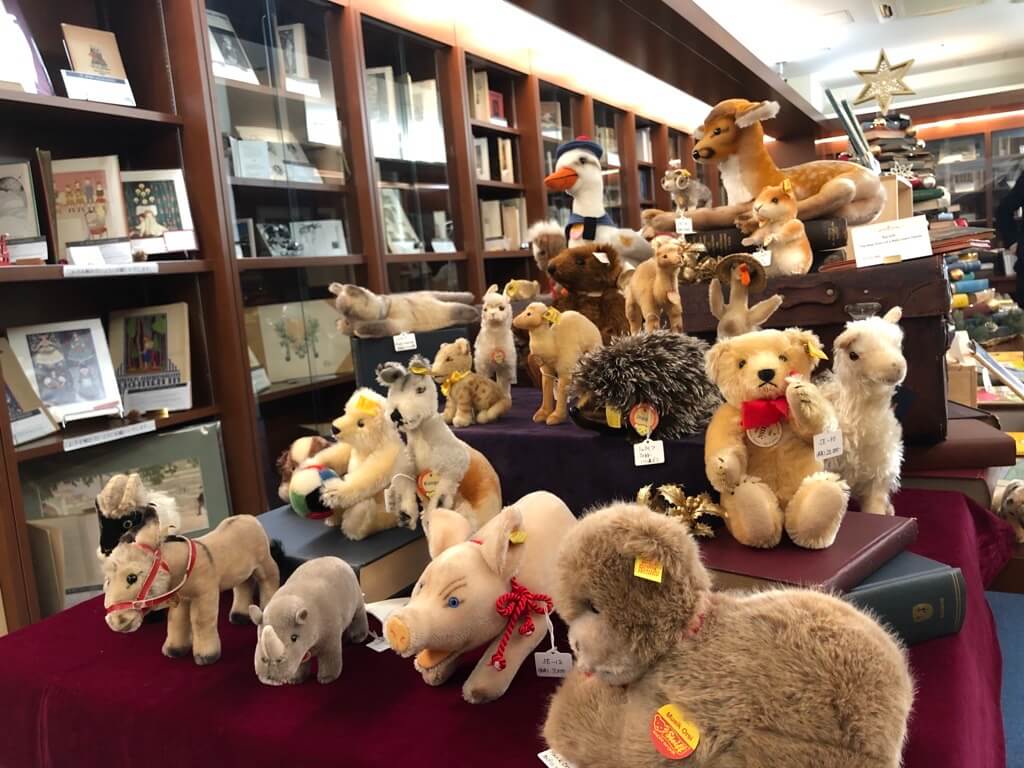 店内を覗くと、クマやブタ、アヒル、ハリネズミ、ラクダなど、さまざまな動物の愛らしいぬいぐるみたちがお出迎えします。これらは、ドイツの老舗人形メーカーであるシュタイフ社のアンティークぬいぐるみで、今回限定販売をしています。世界で初めてティディベアを作ったシュタイフ社のぬいぐるみは、職人の手で一体一体丁寧に手作りされ、同じものは一つとしてありません。大変人気ですので、ぜひお早めにご来店いただきお気に入りの1点を見つけてください。