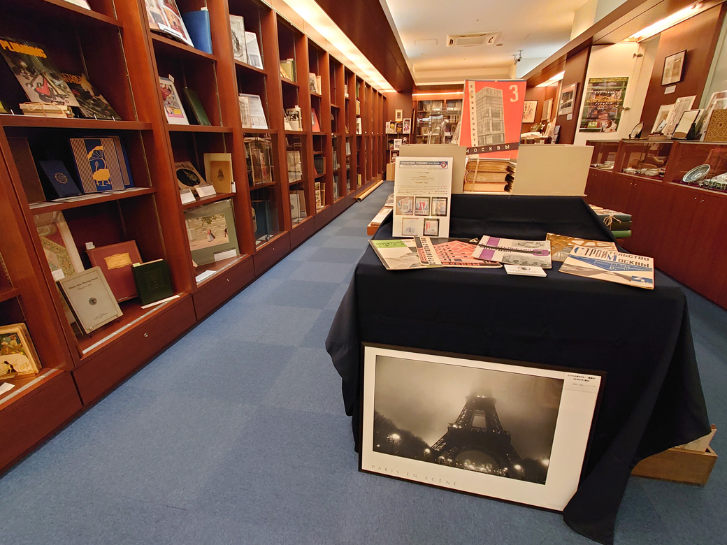 右側のガラスケースには、普段見ることのできない日本大学生産工学部が所蔵する貴重資料であるリヴィエール「エッフェル塔三十六景」(1902年)が「特別展示」として陳列されています。同書には葛飾北斎の浮世絵にちなんで制作された、エッフェル塔をめぐる風景のリトグラフ36点が収録されています。