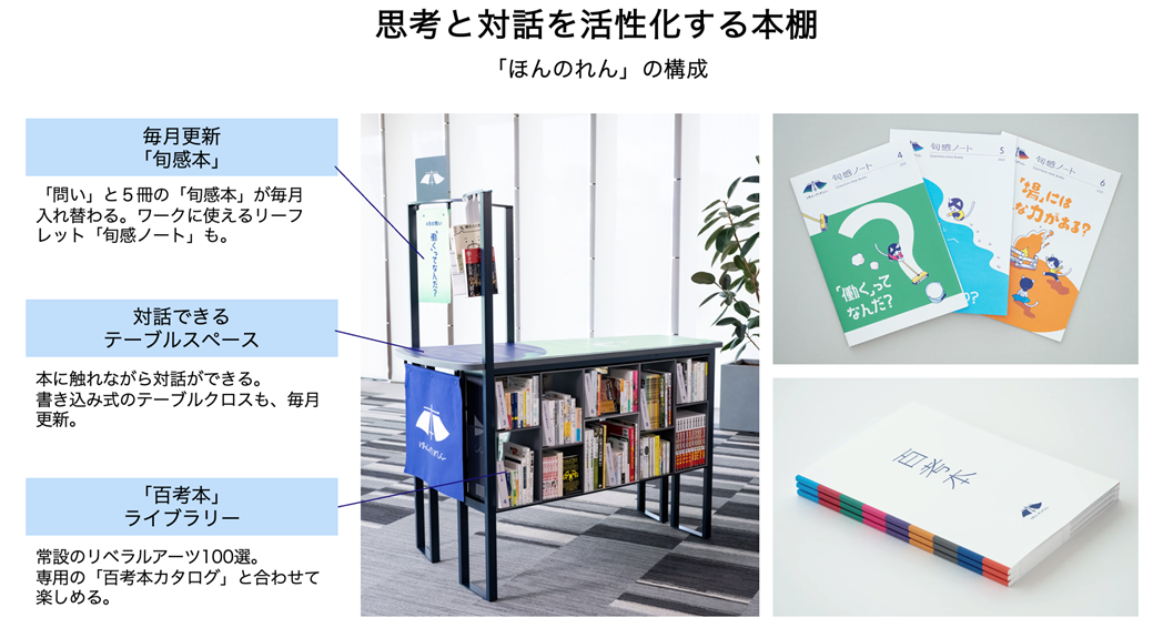 「ほんのれん」は、「問い」と「本」の力で「対話」を起こす“一畳ライブラリー”です。オリジナルデザインの本棚に、思考の基盤となる100冊の本を丸善雄松堂と編集工学研究所がセレクトし、それをセットしてご提供します。さらに、毎月新しい「問い」と5冊の本をお届けします。