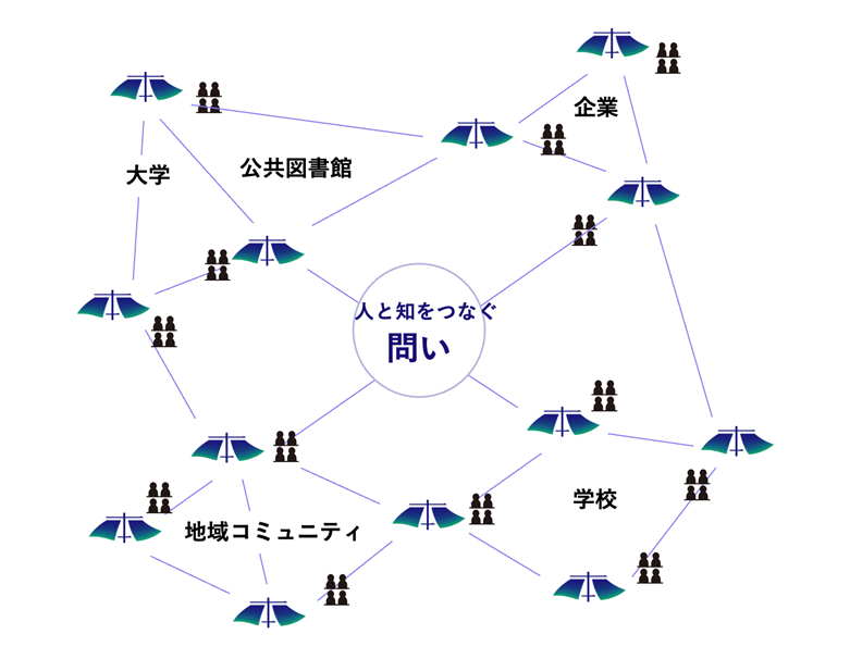 SNSなどのデジタルプラットフォーム上で対話をつなぐことで、場所や時間の制約や日常の範囲を超えて、お互いの問いやアウトプットが交わされ、新たな出会いや気づきが生み出される場を目指します。人と知がつながり、動き、成長していく様をイメージしています。