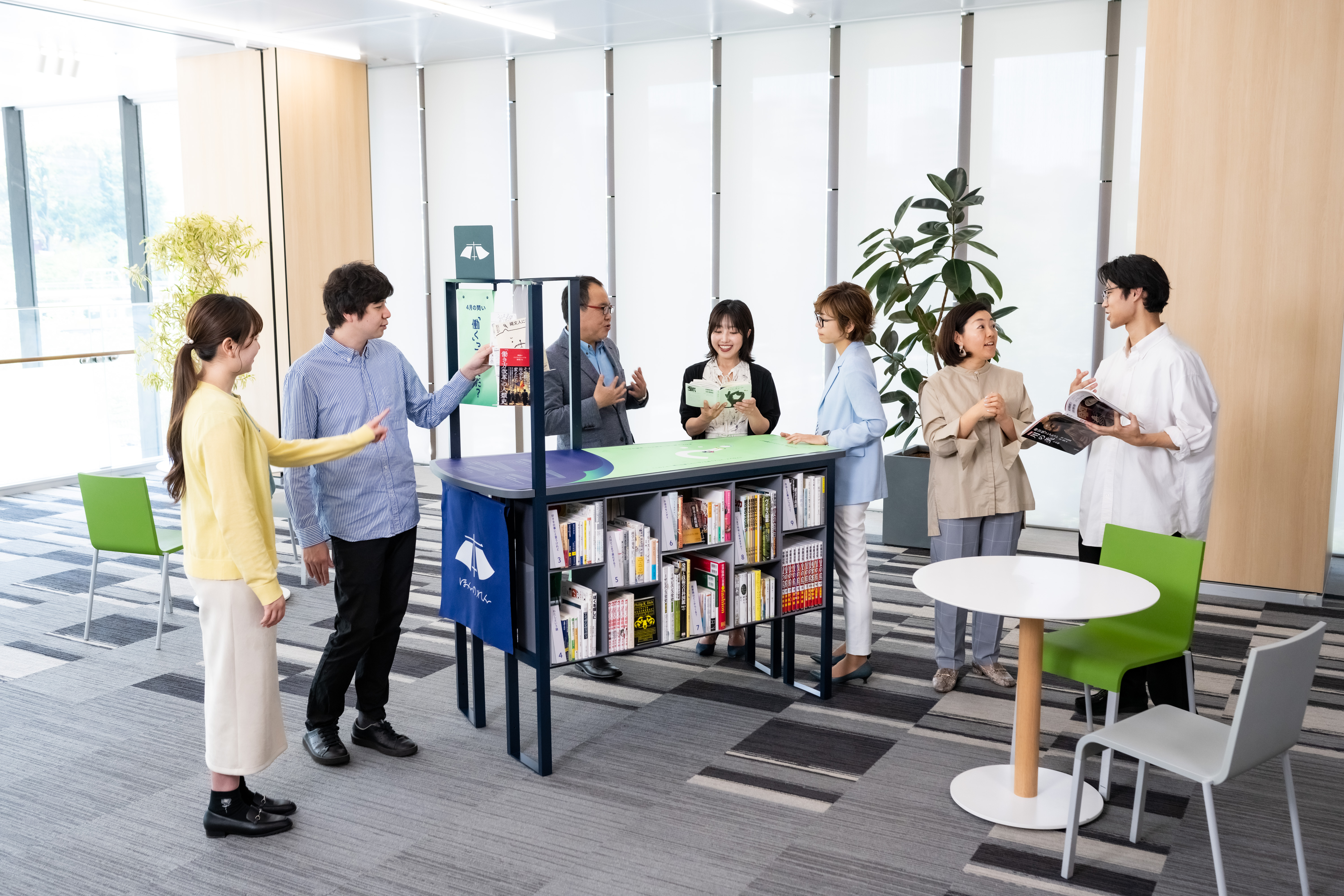 「ほんのれん」オリジナルの本棚や展示ツール(どちらもオプションメニュー)も。オフィス内の空間活用やコミュニケーション活性化目的でも「他に類のないサービス」と好評です。